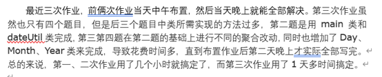 不知不觉,一个学期马上就要过去,也马上就要结课了。由于疫情原因,这学期的Java我们都是在网上学习的。相比于在线下学习,有不好的地方比如学习时候不专注,不能像在学校一样全心投入;但是我认为网上学习也是有好处的,就像老师上课讲的一些东西,我们可以立马在eclipse上自己敲代码尝试,能更好的理解、有时候在线下上课时候不好意思当场问出来,而在线上大家都能在线上大胆提出疑问等等。下面就是我对本次课程的一些收获以及一些近三次作业的小总结。
