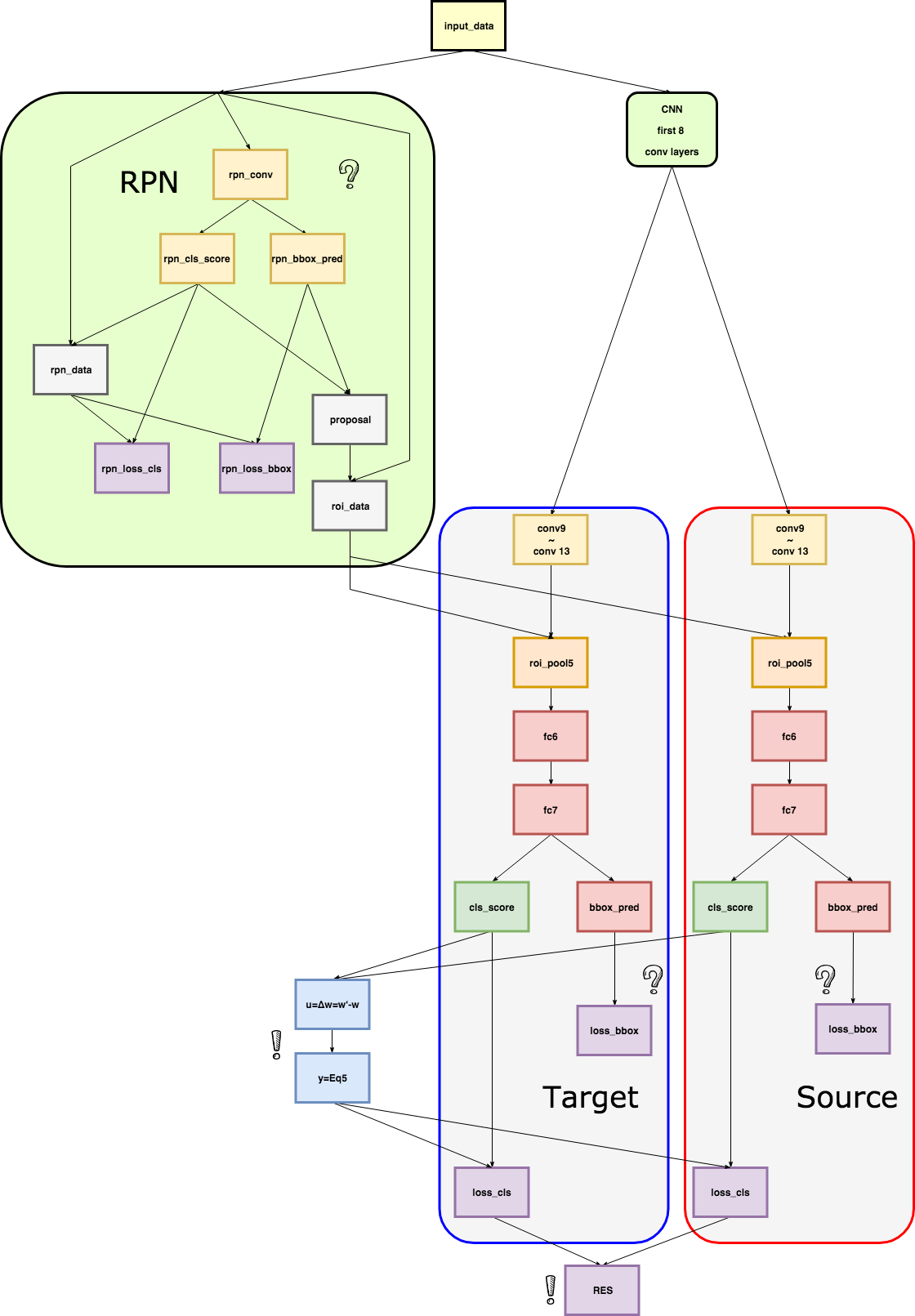 - 这篇文章说固定Faster-rcnn的前8个卷积层,那么剩下的就是可学习的,对于原始网络中除了分类器之外的参数记为\(\theta\),分类器的参数记为\(\mathbf{w}\)。根据原始的网络,新建完全一致的后面的层,作为迁移使用,除了分类器之外的参数记为\(\tilde{\theta}\),分类器的参数记为\(\tilde{\mathbf{w}}= \mathbf{w}+\mathbf{u}\),其实也就是\(\mathbf{u}=\tilde{\mathbf{w}}-\mathbf{w}\)
