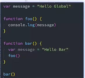 2.跟它的定义位置有关系,跟调用位置没关系,输出Hello Global.