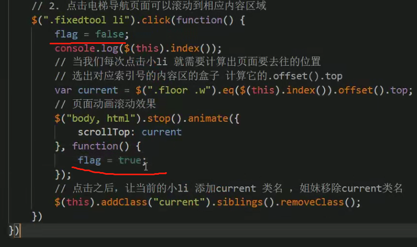13.当我们点击小li,此时不需要执行页面滚动事件里面的li的背景选择,添加current