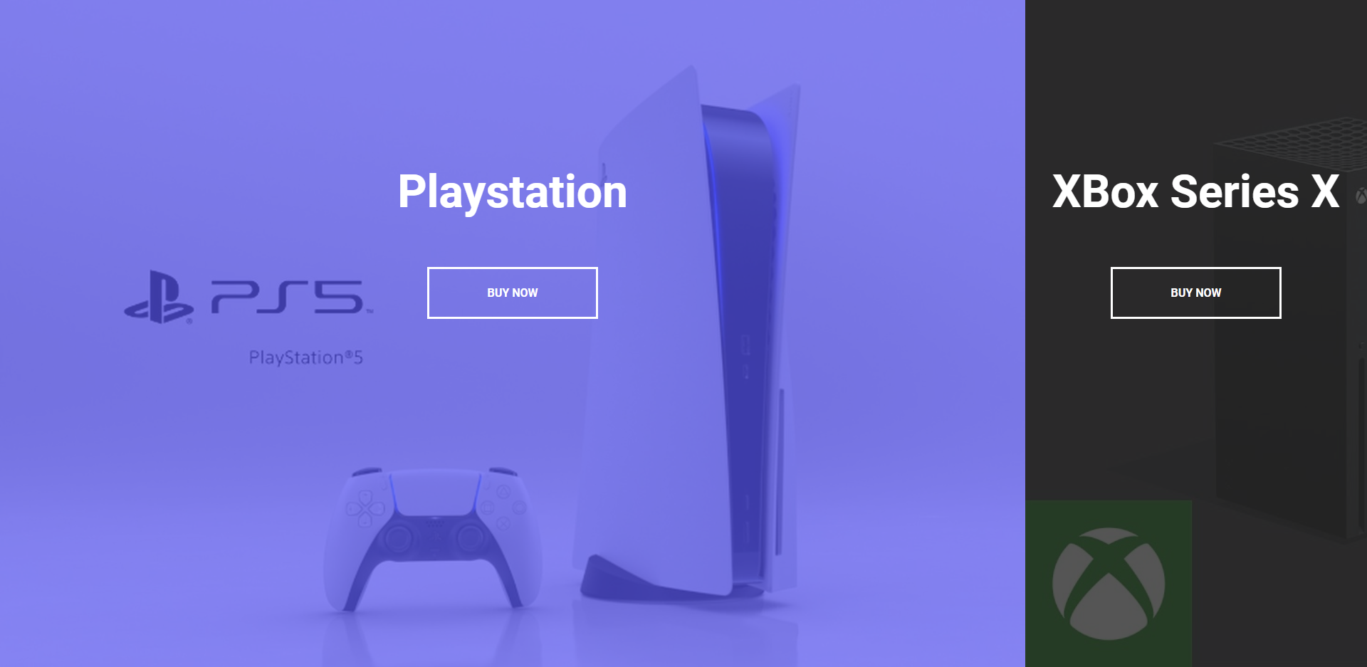 <!DOCTYPE html> <html lang="en"> <head> <meta charset="UTF-8"> <meta http-equiv="X-UA-Compatible" content="IE=edge"> <meta name="viewport" content="width=device-width, initial-scale=1.0"> <title>Document</title> <link rel="stylesheet" href="style.css"> </head> <body> <div class="container"> <div class="split left"> <h1>Playstation</h1> <a href="#" class="btn">Buy Now</a> </div> <div class="split right"> <h1>XBox Series X</h1> <a href="#" class="btn">Buy Now</a> </div> </div> <script src="./script.js"></script> </body> </html>