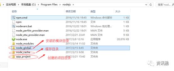 ①、我们要先配置npm的全局模块的存放路径以及cache的路径,例如我希望将以上两个文件夹放在NodeJS的主目录下,便在NodeJs下建立”node_global”及”node_cache”两个文件夹。如下图