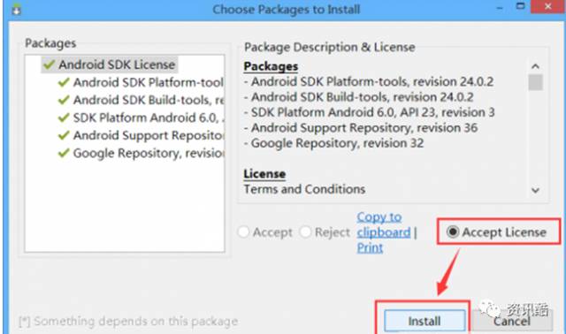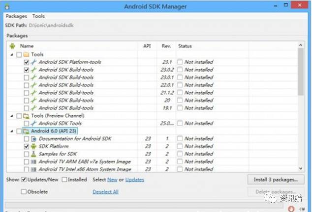 这里千万注意只需要勾选3个Android SDK Platform-tools、Android SDK Build-tools、API23下的SDK Platform (编译的时候会提示你需要的api版本,目前是API23)