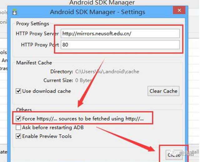 并勾选 “Force https://... sources tobe fetched using http://...单击Close关闭”