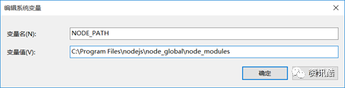 ⑤、进入环境变量对话框,在系统变量下新建”NODE_PATH”,输入”C:\ProgramFiles\nodejs\node_global\node_modules“。(ps:这一步相当关键。)