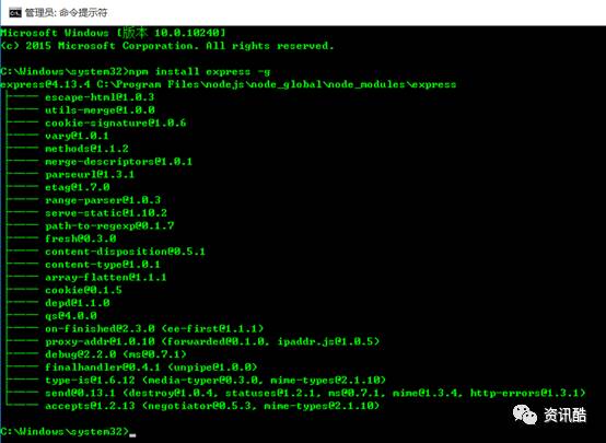 ③、现在我们来装个模块试试,选择express这个比较常用的模块。同样在cmd命令行里面(管理员权限运行cmd),输入