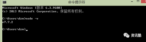 输入:node –v,控制台将打印出:v7.7.2 提示安装成功。