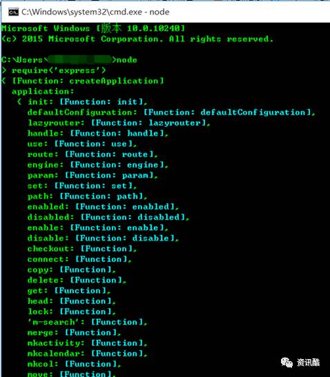 ⑥、以上步骤都OK的话,我们可以再次开启cmd命令行,进入node,输入“require(‘express’)”来测试下node的模块全局路径是否配置正确了。正确的话cmd会列出express的相关信息。如下图(如出错一般都是NODE_PATH的配置不对,可以检查下第④⑤步)