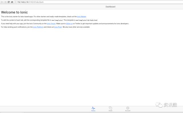 现在我们可以运行ionic server预览下项目、显示如下已经搭建好了一个移动混合式app ionic 框架