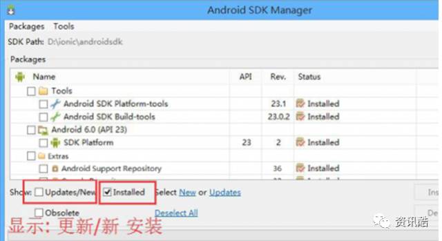 安装完的列表 新版ionic只需装23,如果编译遇到错误就安装API 22的platform