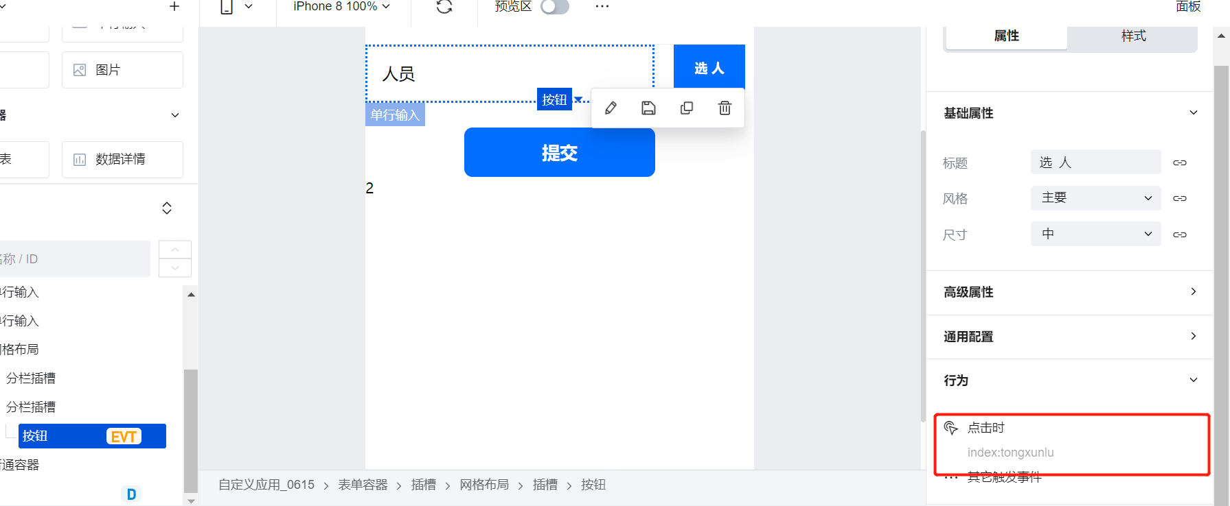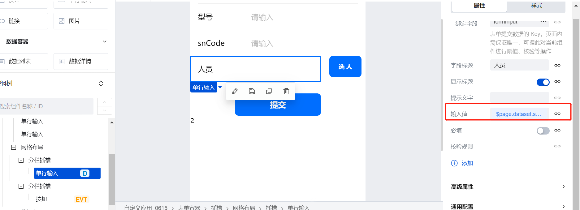 在选人按钮的前面添加一个输入组件并把输入值绑定成我们用来存放用户姓名的参数