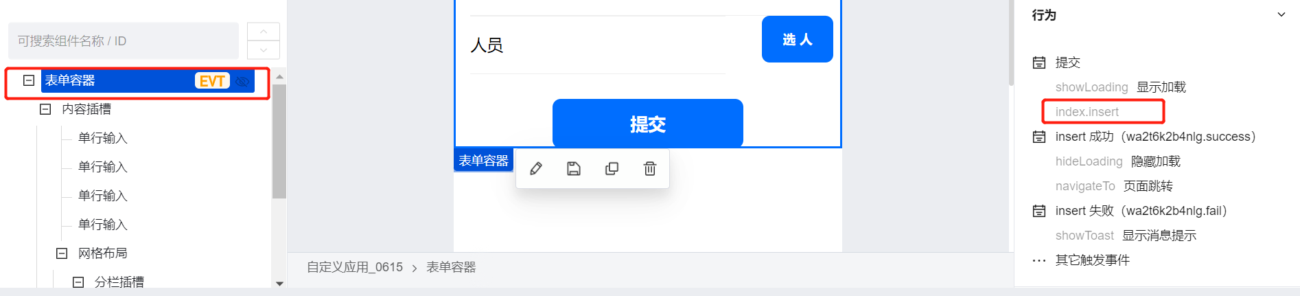 由于企微用户信息我们是保存在变量中的,所以微搭自带的表单提交功能是无法满足我们的需求的,所以我们需要新建一个方法代替原来的插入方法,并点击表单,在它的提交事件中绑定我们自己的方法。