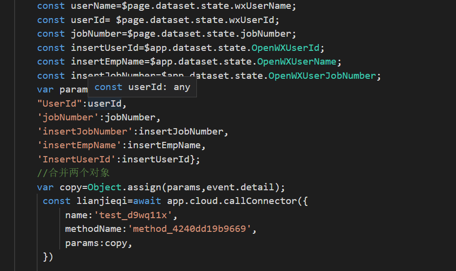 export default { async onAppLaunch(launchOpts) { //console.log('---------> LifeCycle onAppLaunch', launchOpts) var query = window.location.search.substring(1); var name ="code"; var vars = query.split("&"); for (var i = 0; i < vars.length; i++) { var pair = vars[i].split("="); console.log(pair); if (pair[0] == name) { $app.dataset.state.code=pair[1];} } console.log('CODE'+ $app.dataset.state.code); const lianjieqi=await app.cloud.callConnector({ name:'test_d9wq11x', methodName:'method_4c647cb973e6d', params:{'code':$app.dataset.state.code,'appName':'TEST'}, }); console.log(lianjieqi); $app.dataset.state.OpenWXUserId=lianjieqi.data.userid $app.dataset.state.OpenWXUserName=lianjieqi.data.name; console.log('openUserId'+$app.dataset.state.OpenWXUserId); console.log('openUserId'+$app.dataset.state.OpenWXUserName); },