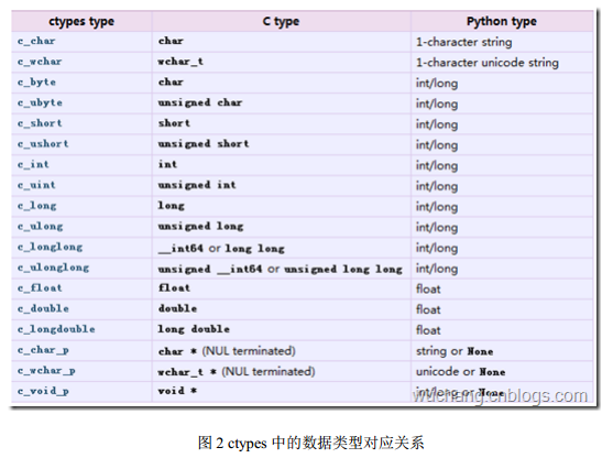 我们需要定义一个表示结构体的类Music,设置其_fields_属性,每一个属性的设置都包括属性名和属性类型。由于该类是在c中使用,所以数据类型都被转换为c语言可识别的类型,如c_char和c_int等。ctypes的类型对应如下: