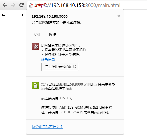 执行 node httpsdemo.js,然后在Chrome里访问access https://192.168.40.158:8000。结果如下: