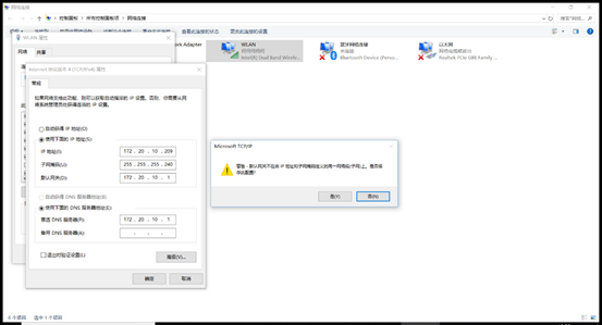 1.打开cmd窗口,ipconfig查看本机IP,并根据学号进行配置,因为本人学号后三位是209,但改完IP地址后显示不在同一网段,导致不能上网,ping不通百度,因而我取了学号后两位09,