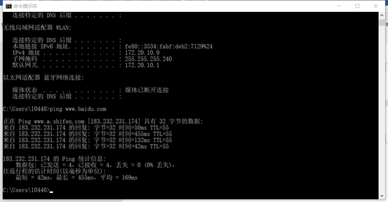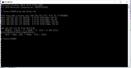 cmd窗口中,ping百度进行测试