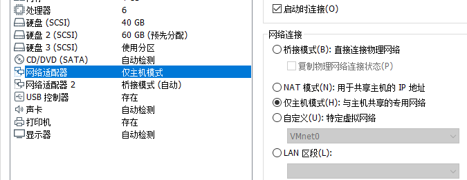 添加双网卡:选择相应系统->虚拟机设置(硬件)->添加->网络适配器(一个配成仅主机模式,一个配成桥接模式)