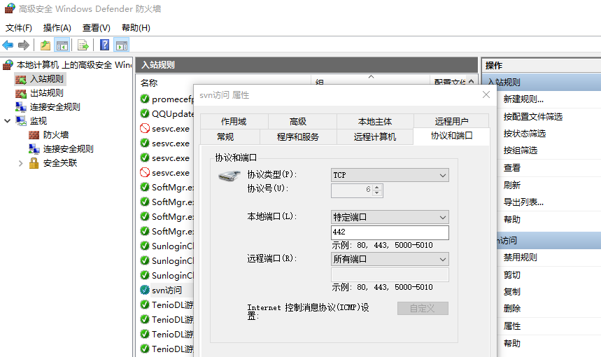 如果数据被windows防火墙拦截可以添加一条入站规则,我的VisualSVN-Server使用端口442
