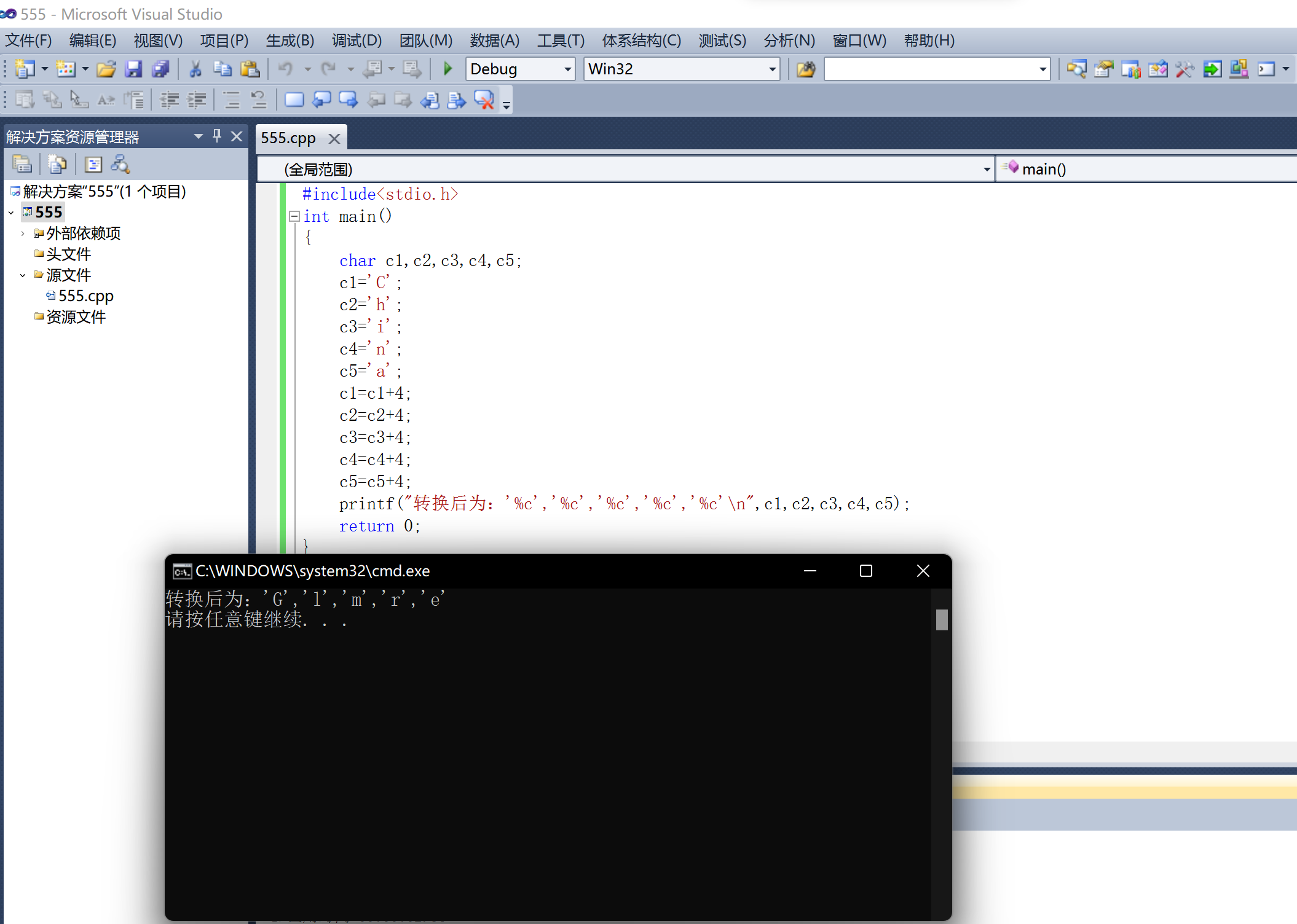 请编程序将“China”译成密码,密码规律是:用原来的字母后面第4个字母代替原来的字母。例如,字母“A"后面第4个字母是“E”,用“E”代替“A”。因此,“China”应译为“GImre”。 请编一程序,用赋初值的方法使c1,c2.c3.c4.c5这5个变量的值分别为C','h','i','n','a' ,经过运算,使c1,c2,c3,c4,c5分别变为'G','T','m','r',e'。 分别用putchar函数和printf函数输出这5个字符。