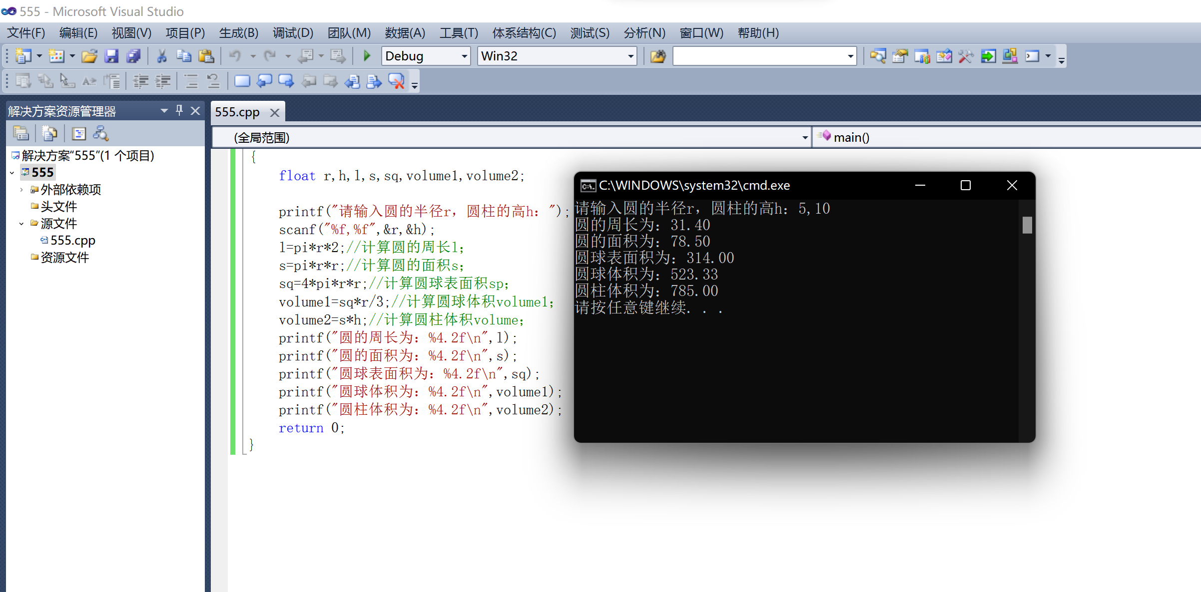 设圆半径r=1.5,圆柱高h=3,求圆周长、圆面积、圆球表面积、圆球体积、圆积。用scanf输人数据,输出计算结果,输出时要求有文字说明,取小数点后2位数字2编程序。