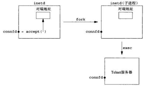 inetd调用accept返回两个值:已连接套接字描述符conned,这就是函数的返回值;客户的IP地址及端口号,图中标有“对端地址”的小方框所示。inetd随后调用fork,派生出inetd的一个子进程。既然子进程起始于父进程的内存映像的一个副本,父进程中的那个套接字地址结构在子进程中也可用,那个已连接的套接字描水也是如此(因为描述符在父子进程之间是共享的)。然而当子进程调用exec执行真正的服务器程序文件(譬如说Telnet服务程序)时,子进程的内存映像被替换成新的Telnet服务器的程序文件(也就是说包含对端地址的那个套接字地址结构就此丢失),不过那个已连接套接字描述符跨exec继续保持开放。Telnet服务器首先调用的函数之一便是getpeername,用于获取客户的IP地址和端口号。