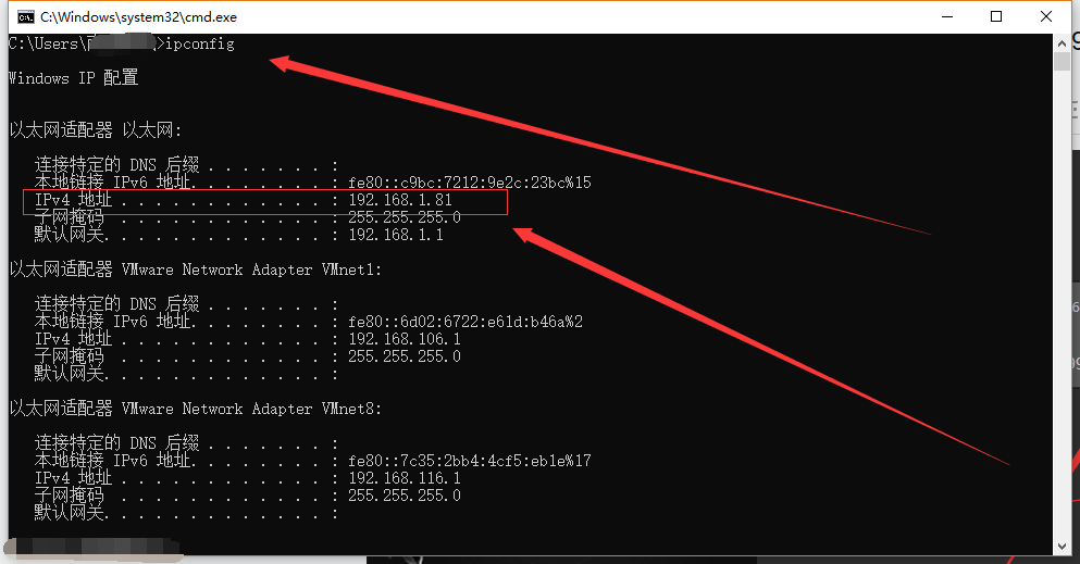 CMD命令下,输入ipconfig