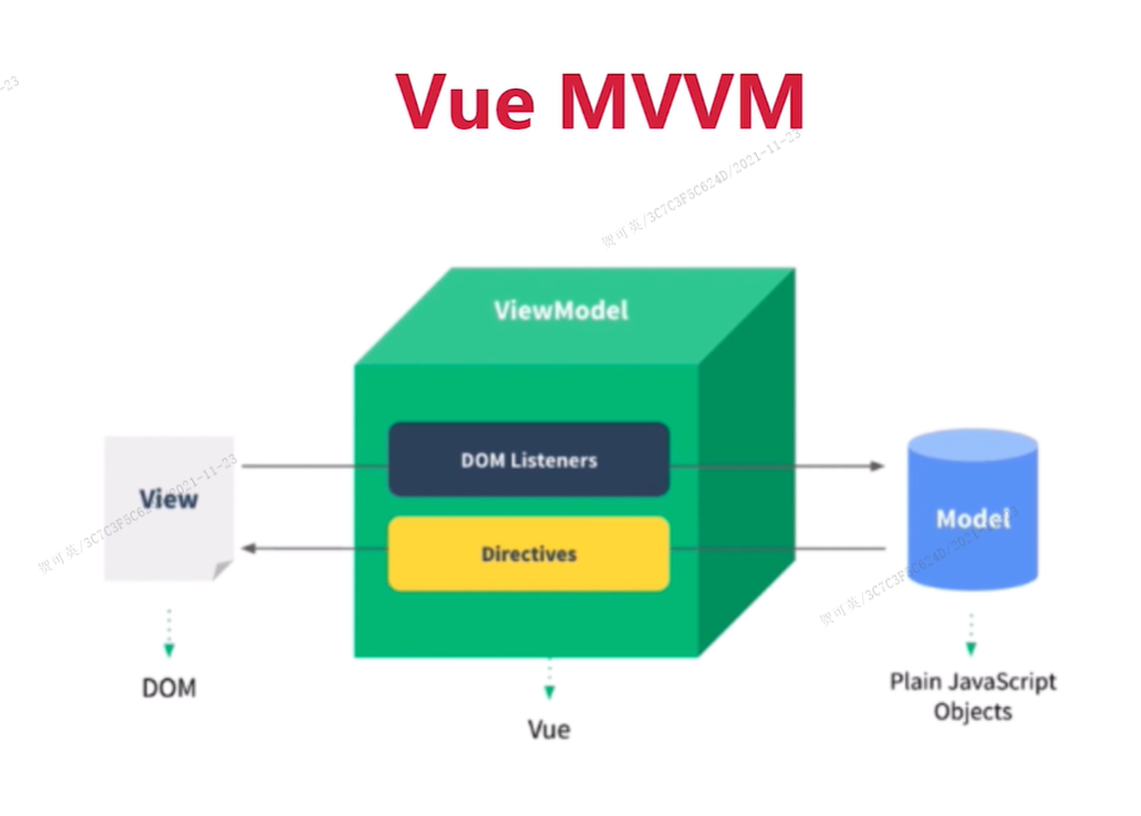 View 视图 Model 模型 (也就是vue中的data) 通过vue ViewModel(视图模型) directives 指令