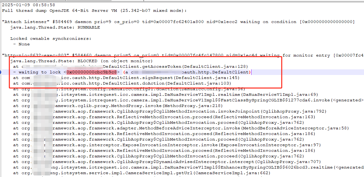 大量线程处于BLOCKED状态,等待锁0x00000000cbc9b9c8的释放;