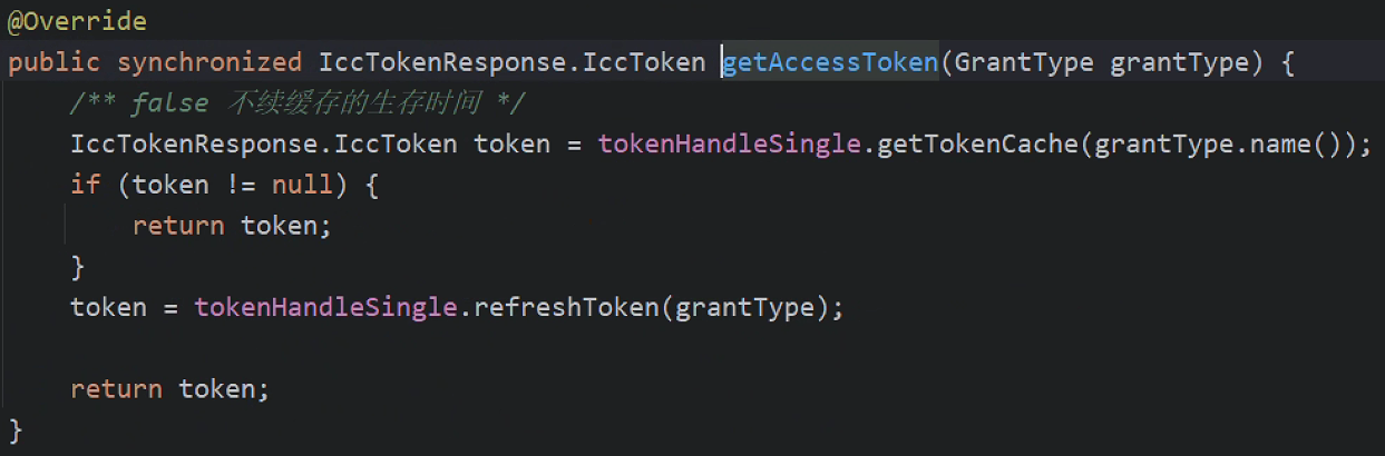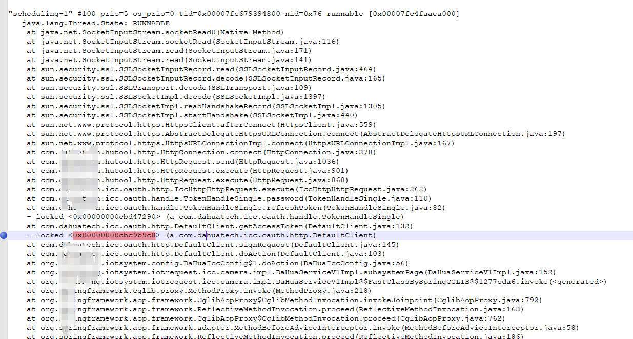 通过观察上图,发现锁在getAccessToken方法中被获取,该方法是一个同步方法,由于socket连接长时间阻塞,导致锁无法释放。