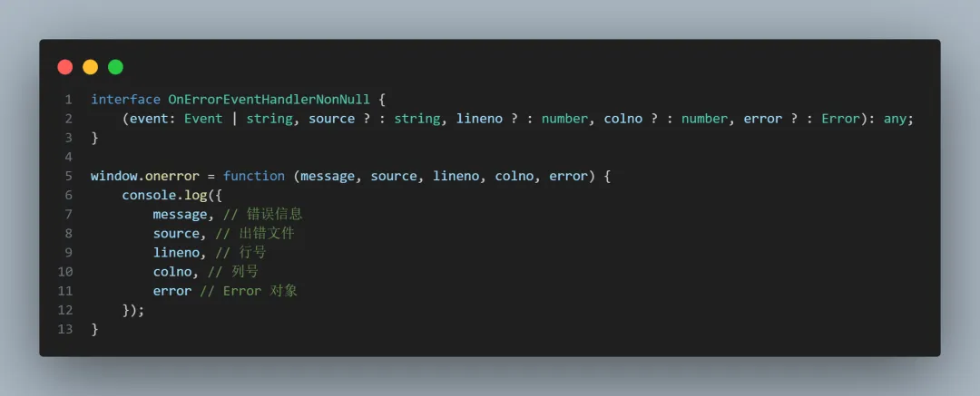 代码报错时,会触发 window.onerror 回调函数,这个回调函数接受了以下几个参数