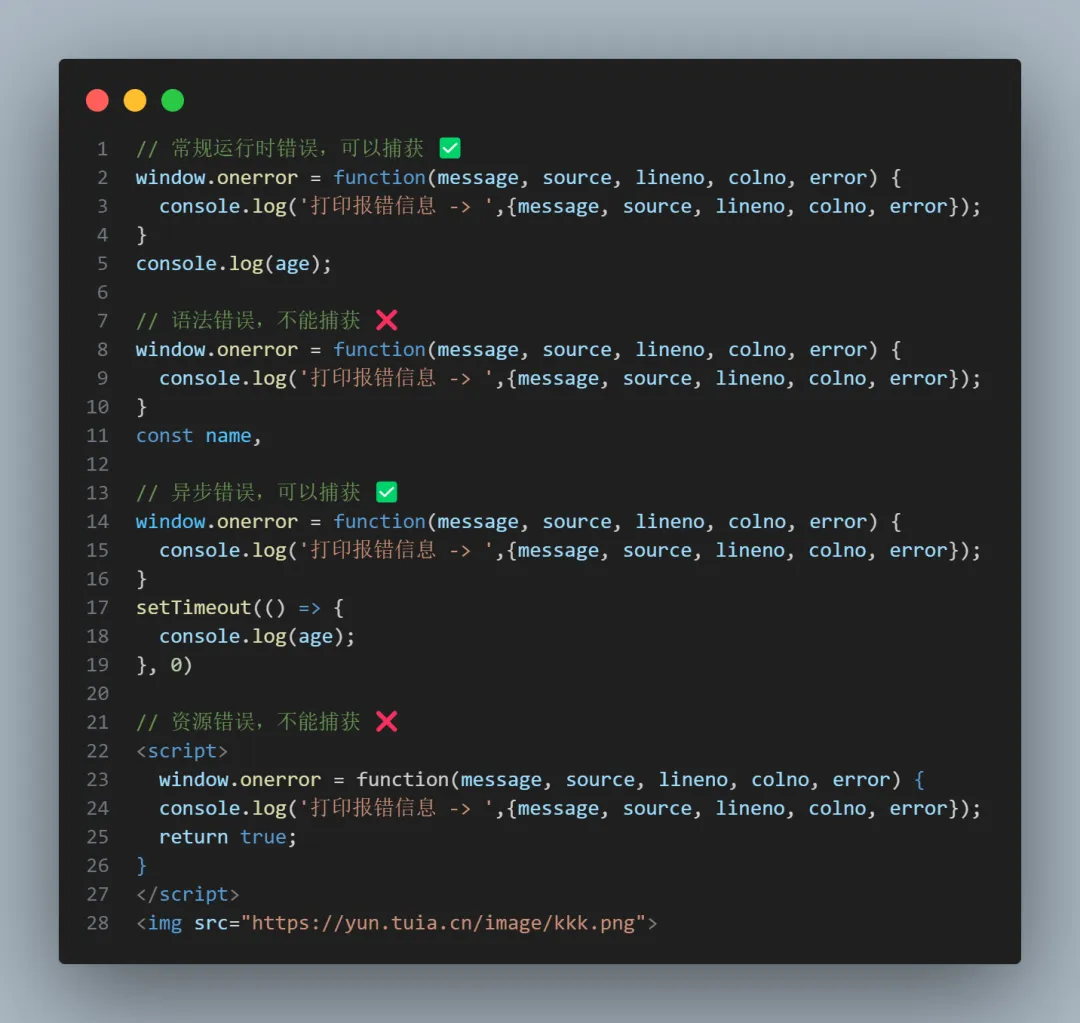 try...catch 是捕获错误的重要方式,但是它只能捕获运行报错、同步报错,捕获不了 编译报错、异步报错