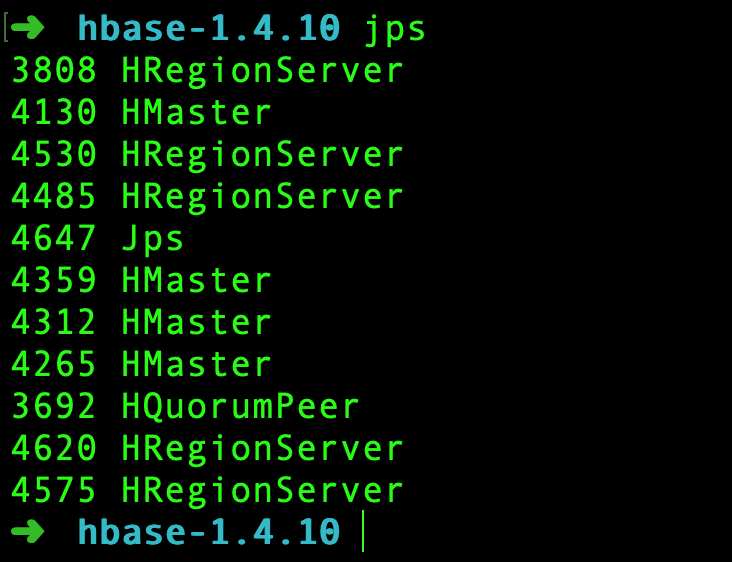 笔者电脑上启动了三个备份HMaster,五个HRegionServer,其中一个是执行start-hbase.sh启动,另外四个则是local-regionservers.sh start 2 3 4 5启动。