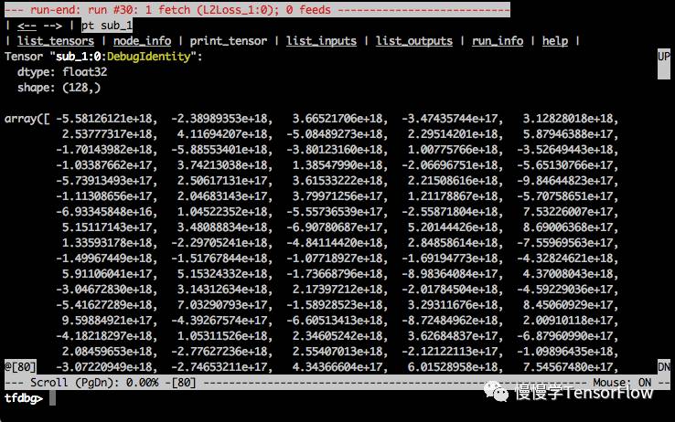 它的值为 Inf,为什么会变为 Inf 呢?我们继续跟踪它前一级 tensor(通过命令 “ni L2Loss_1:0” 得知前一个 tensor 为 sub_1,再使用 “pt sub_1” 命令打印 sub_1 的值)