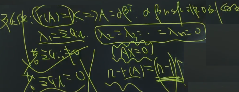 因为秩为1,对于特征值为0的无关特征向量,恒为n-1个;如果迹不为0,则可以再得到一个无关的特征向量;
