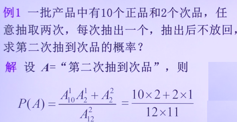 第一次抽到次品且第二次也抽到次品的概率,公式的后半部分:2/12 * 1/11 = 2/132