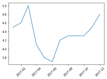 date shiyelv 0 2017-01-01 4.5 1 2017-02-01 4.6 2 2017-03-01 5.0 3 2017-04-01 4.1 4 2017-05-01 3.8