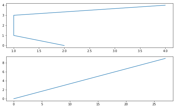 fig = plt.figure(figsize=(10, 6)) # 指明画图区间的大小 ax1 = fig.add_subplot(2, 1, 1) ax2 = fig.add_subplot(2, 1, 2) ax1.plot(np.random.randint(1, 5, 5), np.arange(5)) # 为第1个子图添加数据 ax2.plot(np.arange(10)*3, np.arange(10)) # 为第2个子图添加数据 plt.show()