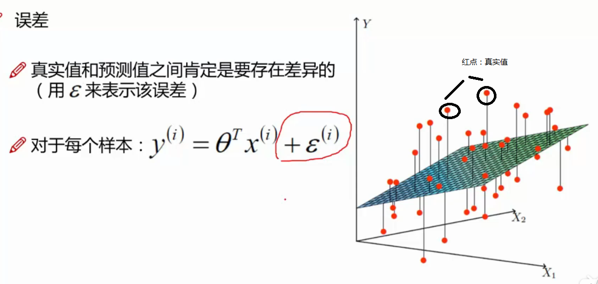 对于每一个样本,如图所示,红色的点为真实值,真实值与拟合平面存在差值,这是不可避免的,这个差值,称为误差。