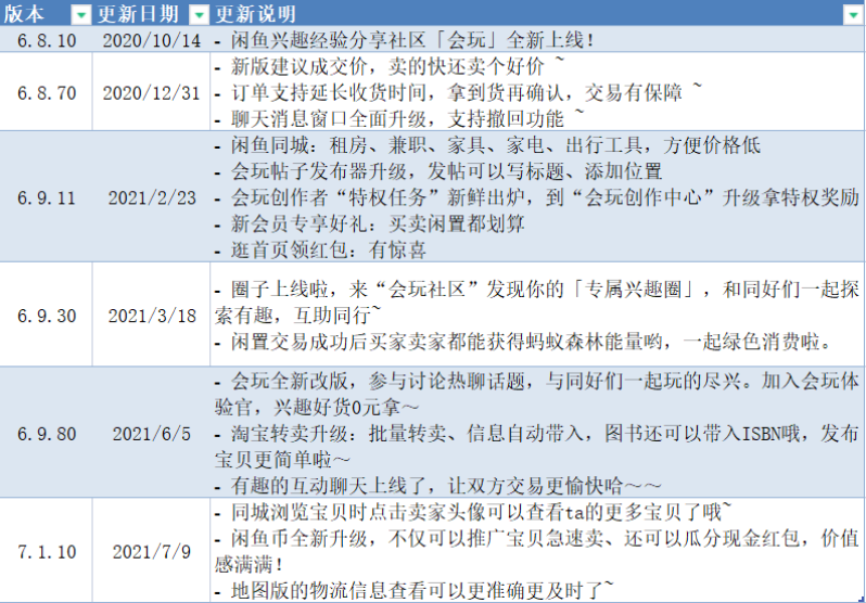 迭代分析1:这是闲鱼对买家卖家社区的重要布局,社区功能的加入让用户不止拥有买卖双方的关系,提供一个互动分享的平台。满足一部分用户展示好物、分享兴趣需求及一部分用户浏览观看的需求。“会玩”功能的上线让闲鱼的整体内容更加丰富与立体,同时将会对用户的黏度有很大提升。可以猜测闲鱼将要从一个工具性质的二手交易平台向一个更多元的集工具、资讯、社区为一体的大型平台转型。