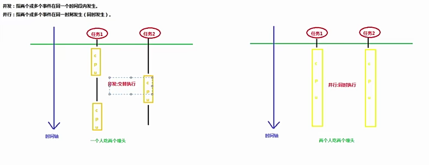 并发:两个或多个事件在同一时间段内发生。cpu交替执行