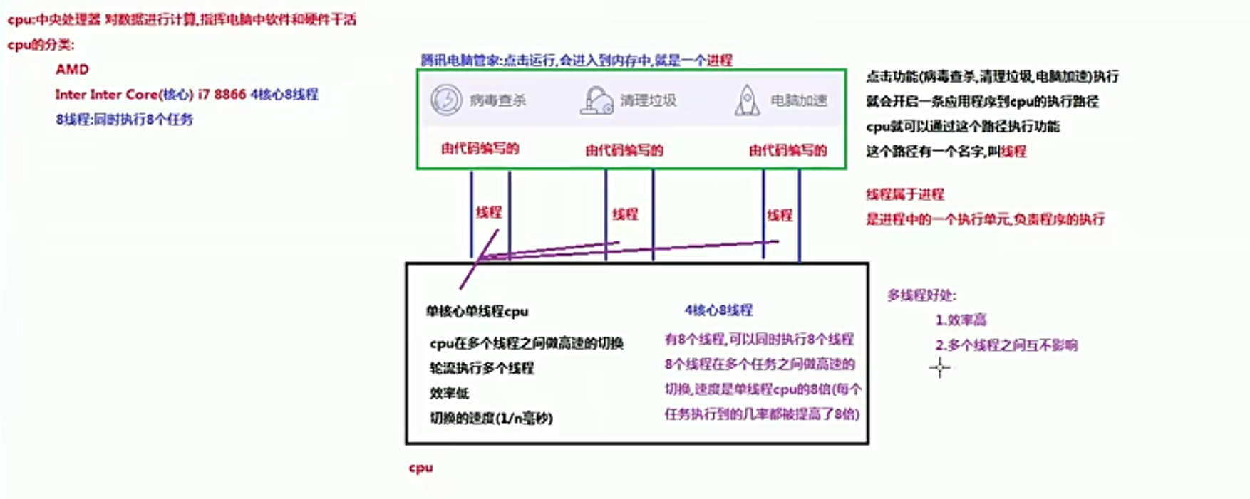 cpu:中央处理器,对数据进行计算,指挥电脑中的软件和硬件干活