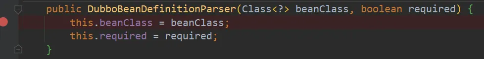 在构造器处打上断点,看这个 DubboBeanDefinitionParser 是怎么创建出来的。