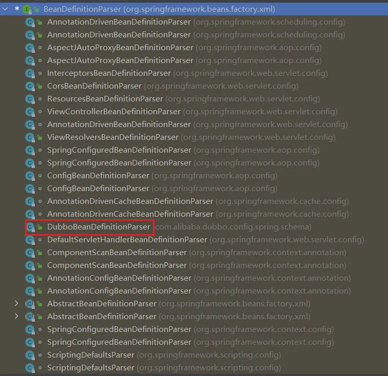 这个处理器在 init() 方法注册了特别多的 DubboBeanDefinitionParser 标签解析器。
