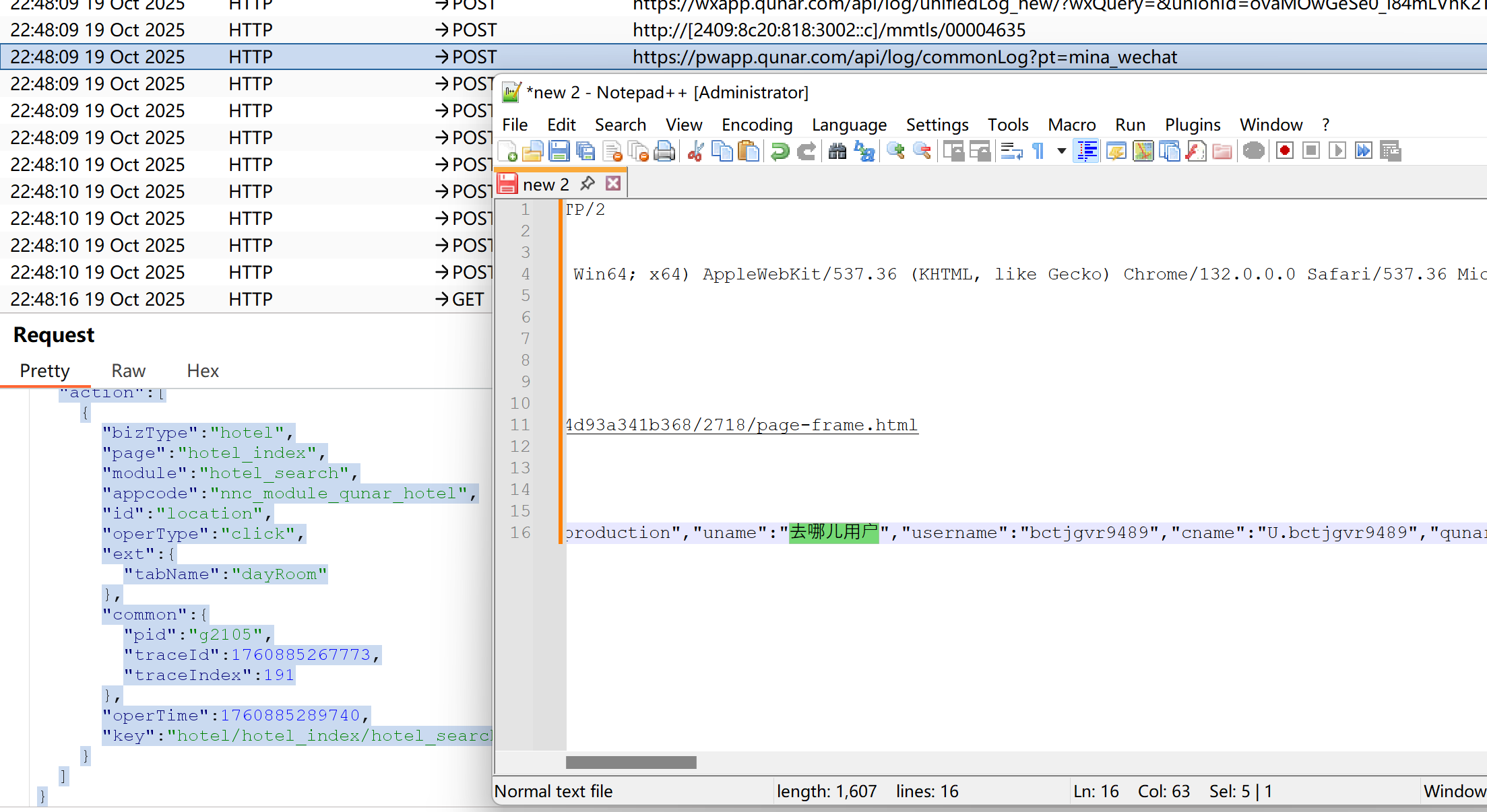 关闭intercept ==> 打开小程序==>http history==>这里找数据包==>看到数据复制到notepad++ 默认编码是utf-8==>查看部分数据原文
