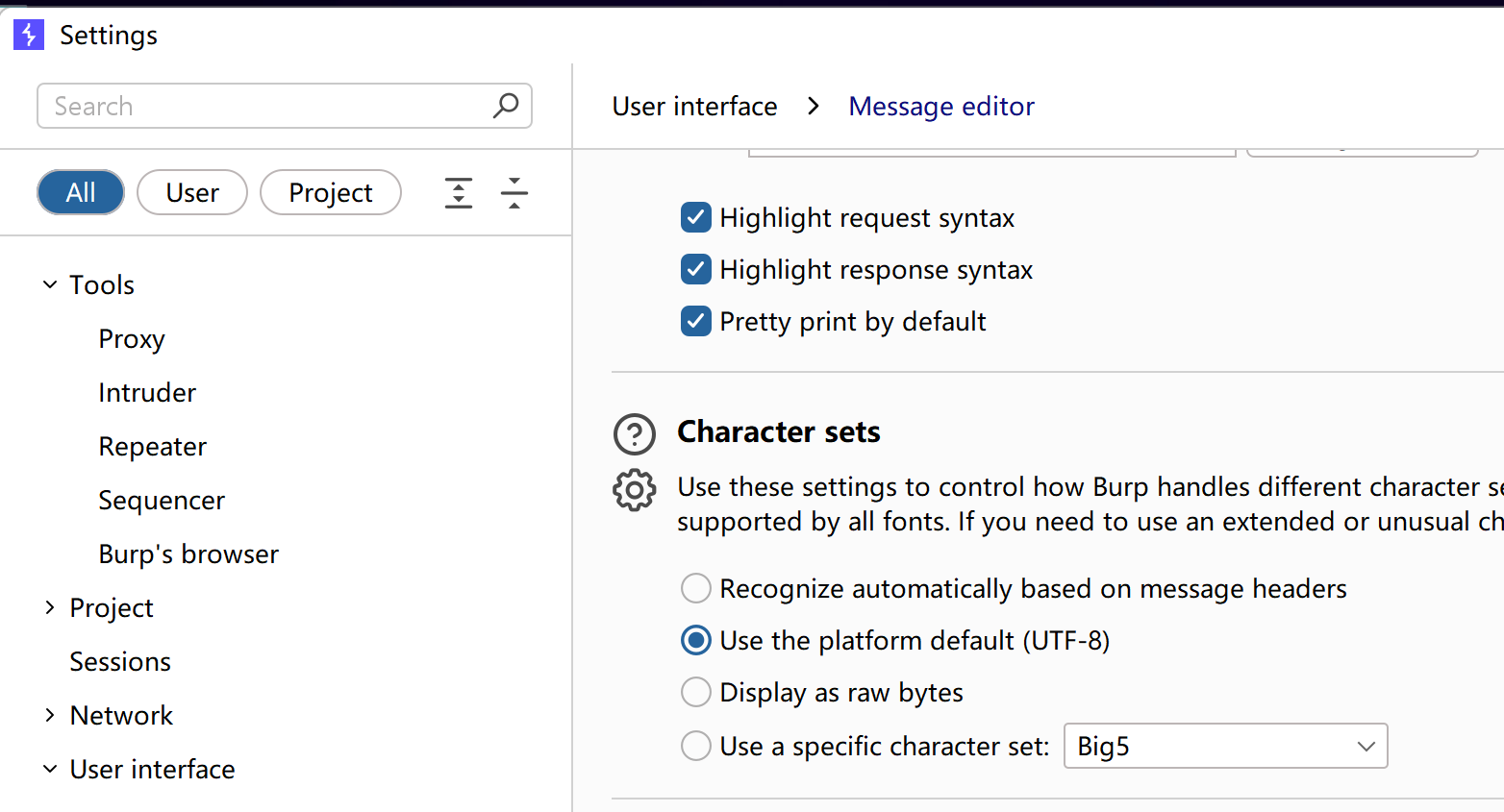 右上角设置==>user interface ==>message editor ==> use the platform default (utf-8)
