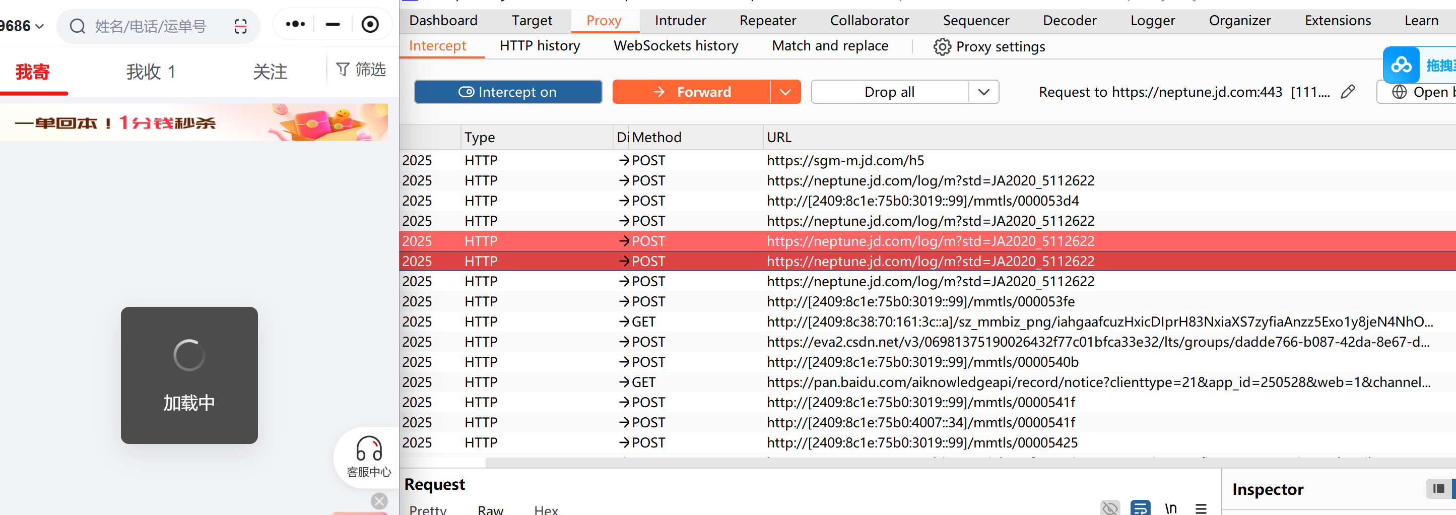 回到burpsuite 打开小程序(我打开的是京东快递)