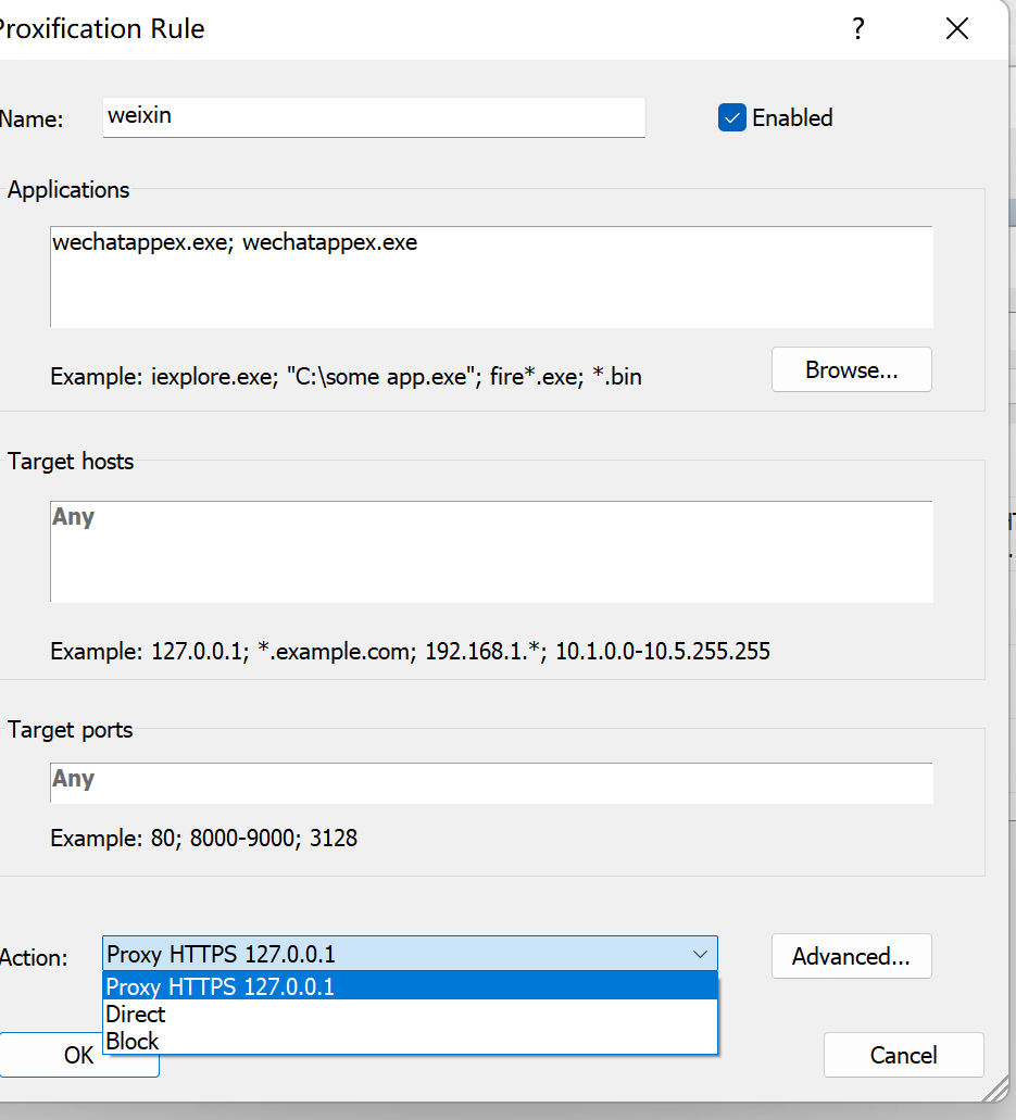 Proxifier:通过进程级代理规则,强制微信小程序相关进程的流量流向 Burp,突破系统代理绕过限制