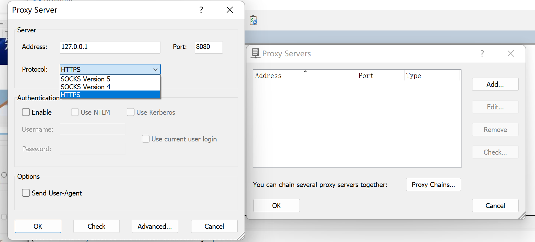 点击 add ==> 填写 address port (根据自己burpsuite代理ip 端口) protocol(https) ==>点击 ok