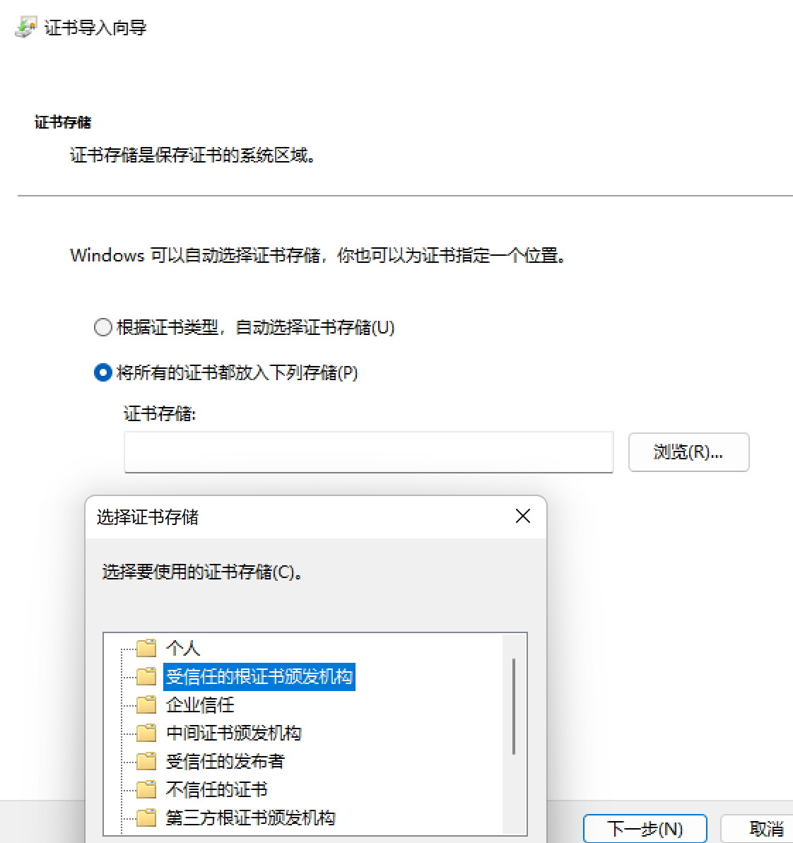 将所有证书放入下列存储==> 浏览 ==> 受信任的根证书颁发机构